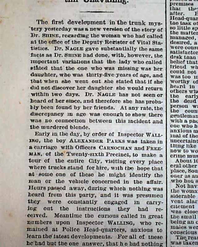 The back page has one column headlines that include: "THE EVIL OF THE AGE" "Satisfactory Progress in Developing the Trunk Mystery" "Arrest Of The Abortionist" and more. (see) Lengthy text here.