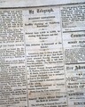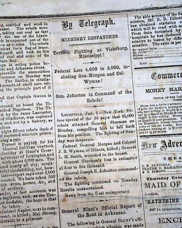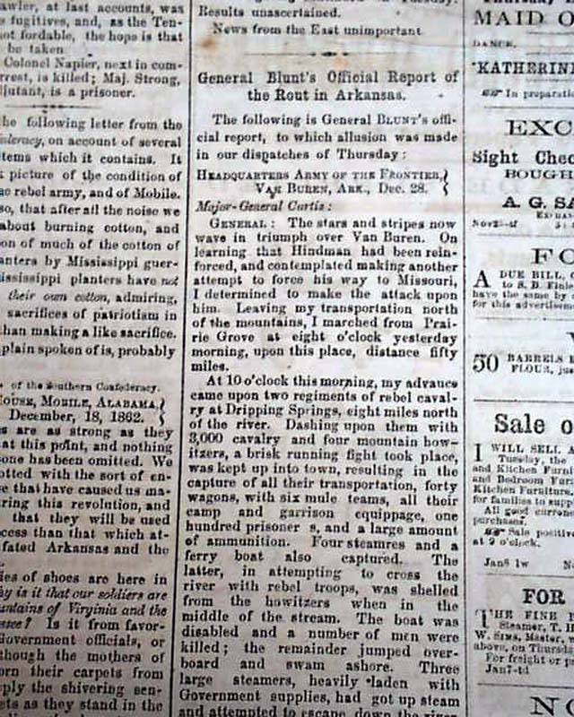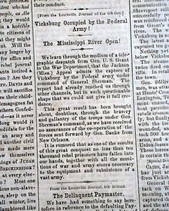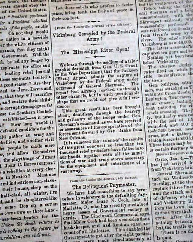 Over half of the front page is taken up with Civil War related reports. War content continues on the back page as well with: "The Return of Peace" "The Mississippi River Open!" "Vicksburg Occupied by the Federal Army!" "Terrible Fighting at Vicksburg, Mississippi!" "Gen. Johnston in Command of the Rebels!" "General Blunt's Official Report of the Rout of Arkansas" and more.