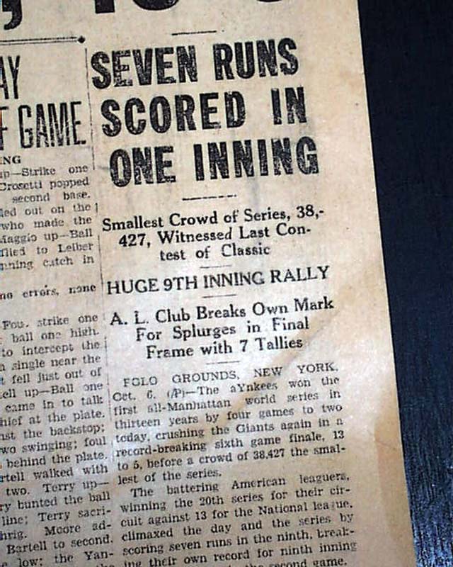 This front leaf only has a nice five column headline: "YANKEES CRUSH GIANTS IN SERIES FINAL, 13-5" with subheads and box scores. (see)