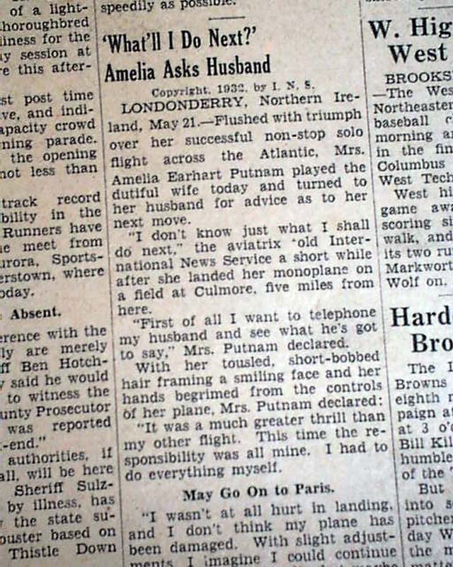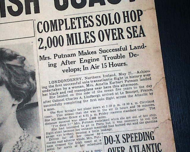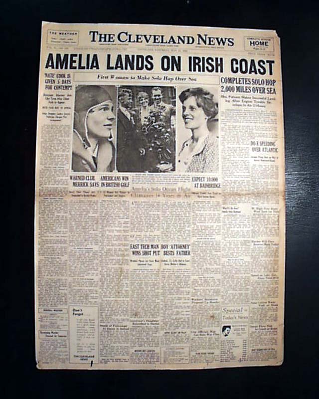 This front leaf only has a great banner headline: "AMELIA LANDS ON IRISH COAST" with subhead and pictorial. (see) This was the first female solo flight across the Atlantic. See the hyperlink for more.