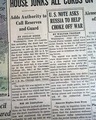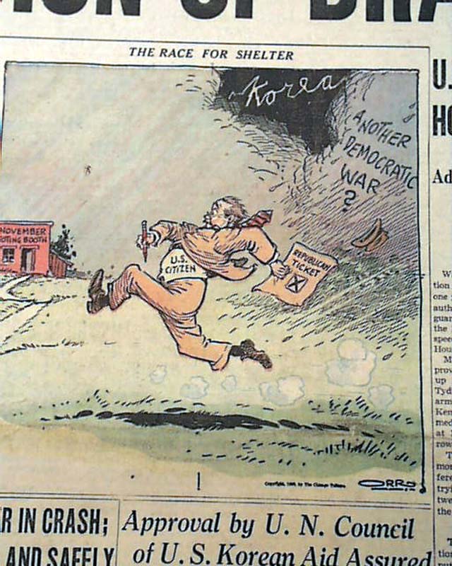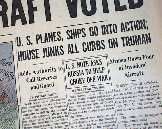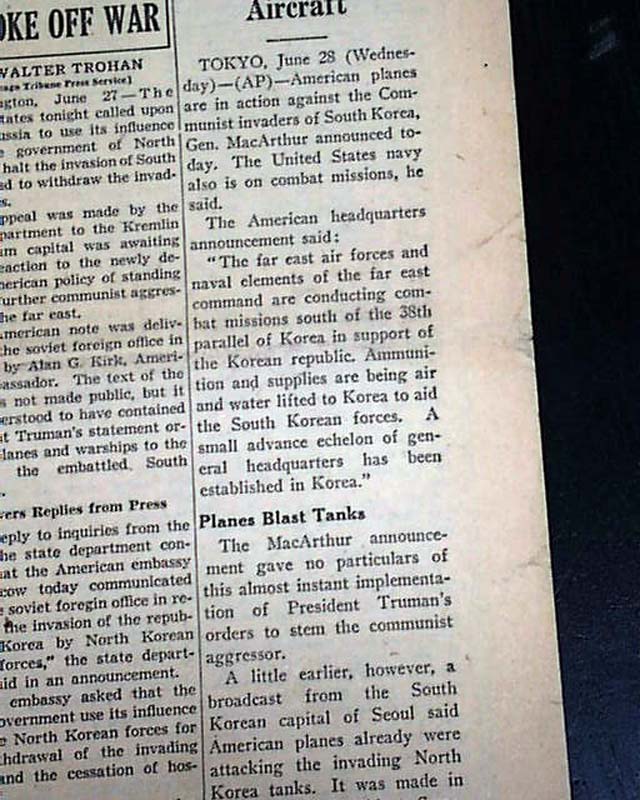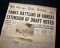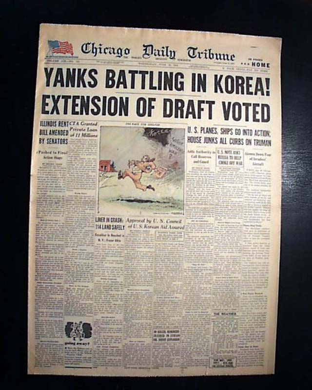 An historically significant headline as it reports the entry of the United States in the Korean War: "YANKS BATTLING IN KOREA!; EXTENSION OF DRAFT VOTED" with related subheads and illustration.