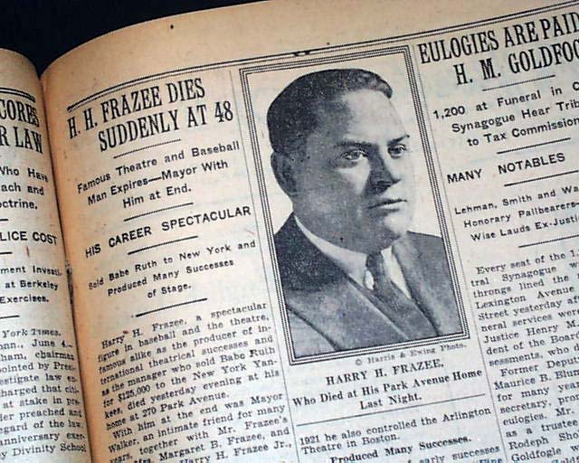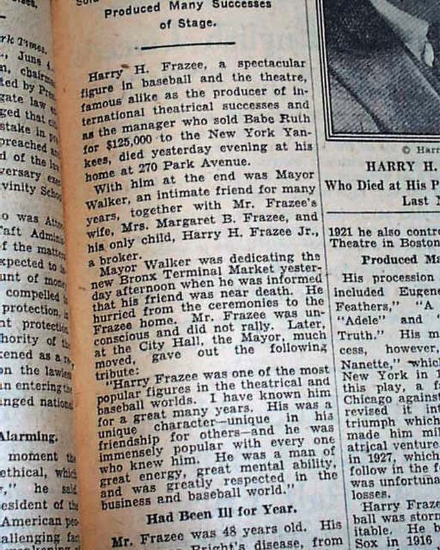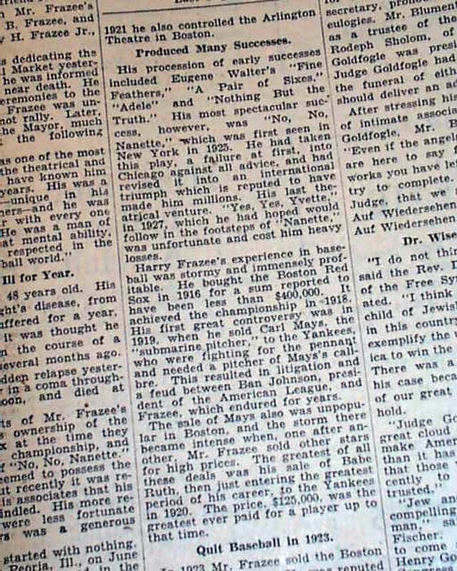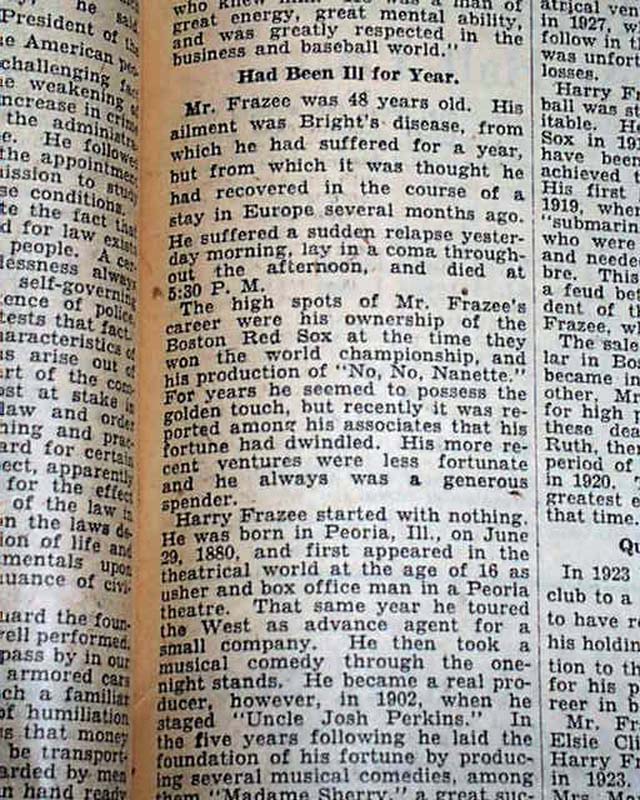 Page 29 has a one column heading: "H. H. FRAZEE DIES SUDDENLY AT 48" with subheads and photo. (see) 1st report coverage on the death of former Boston Red Sox owner Harry Frazee. He was known for selling Babe Ruth to the Yankees thus starting the Curse of the Bambino.