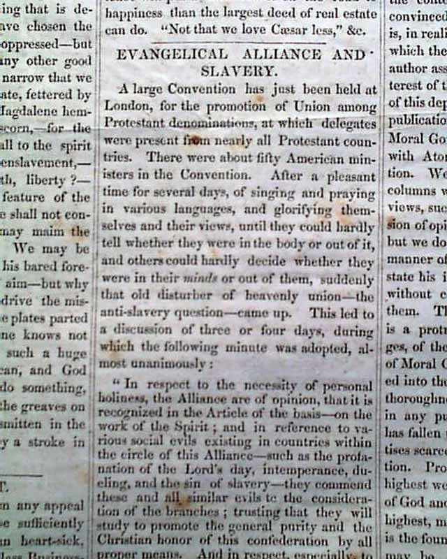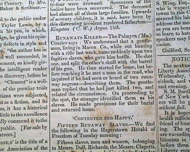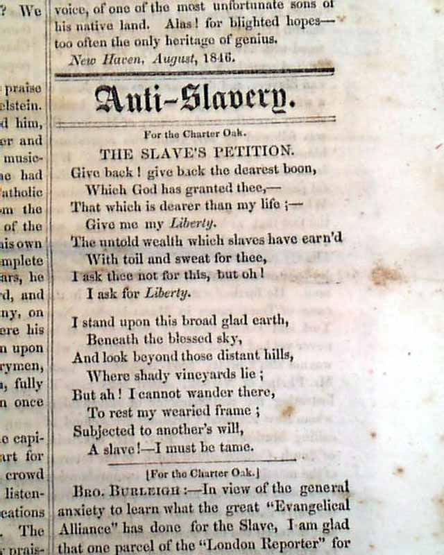 A very uncommon title originally published as the Christian Freeman by the Connecticut Anti-Slavery Society, and then under this title. Obviously has anti-slavery content, but also news of the day and other content. The front page has a poem: "The Slave's Petition". A volume I issue (number 39), with an engraving of an oak tree in the masthead.