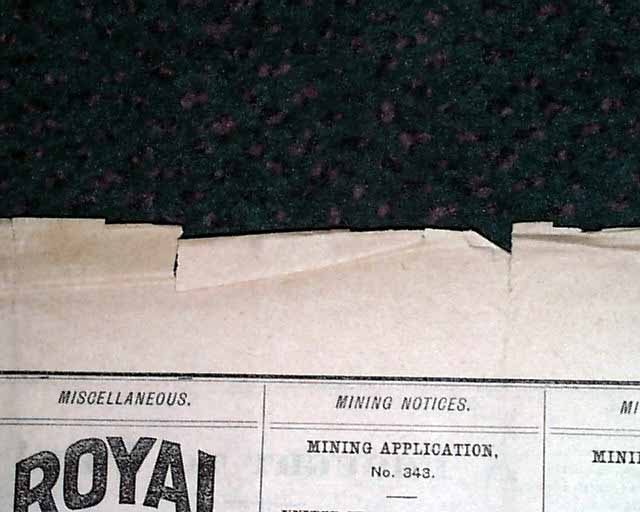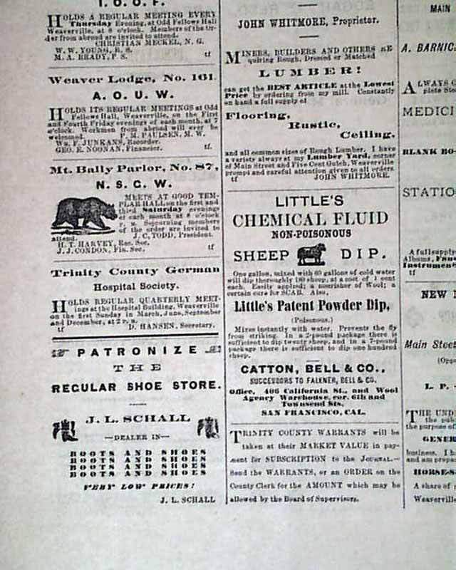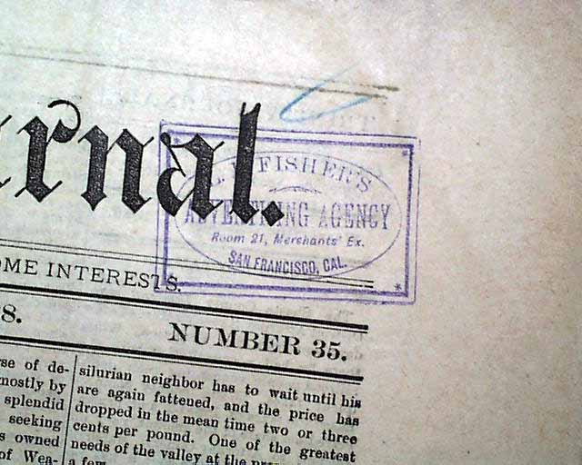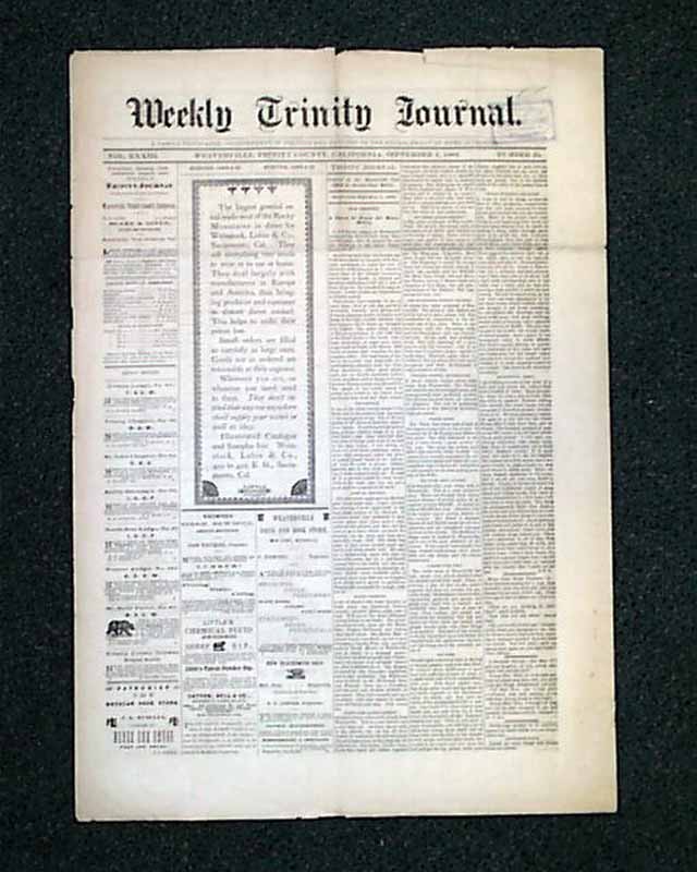 A quite rare issue from this Northern California town and uncommon to find from the 19th century. This is the first of this title we have had in some time. A complete four page issue filled mostly with various local news tidbits but many ads as well, many of which are illustrated. Even browning throughout and minor fold wear with no text loss, some tears at the margin, slightly irregular at the spine, a news agent's stamp on the masthead, blue colored pencil mark above masthead and minor chipping around edges. (See photos for details)