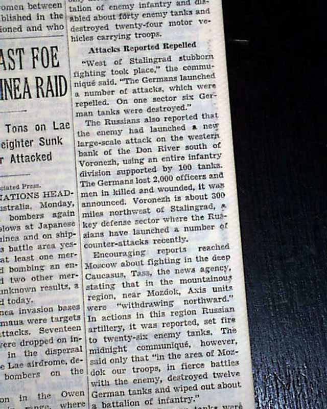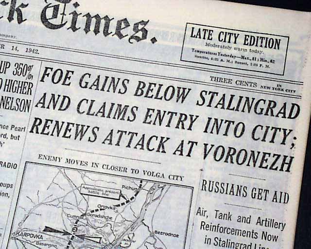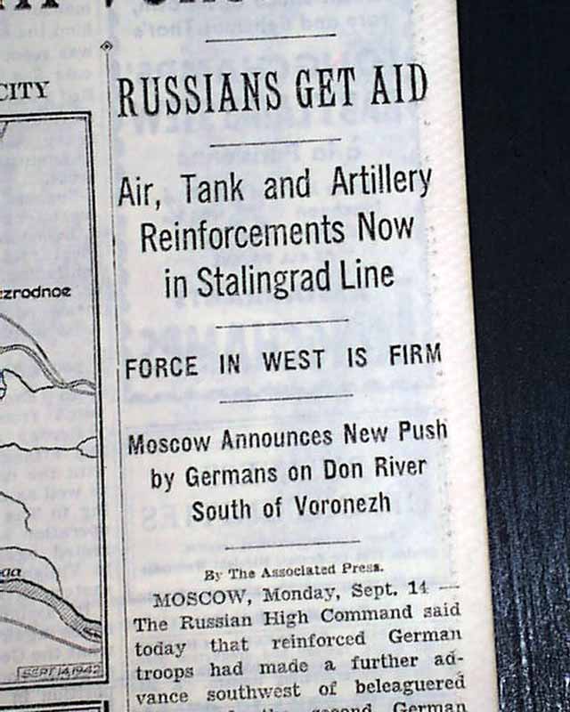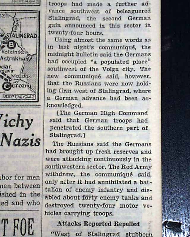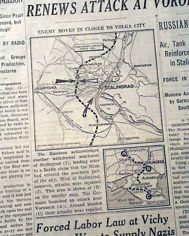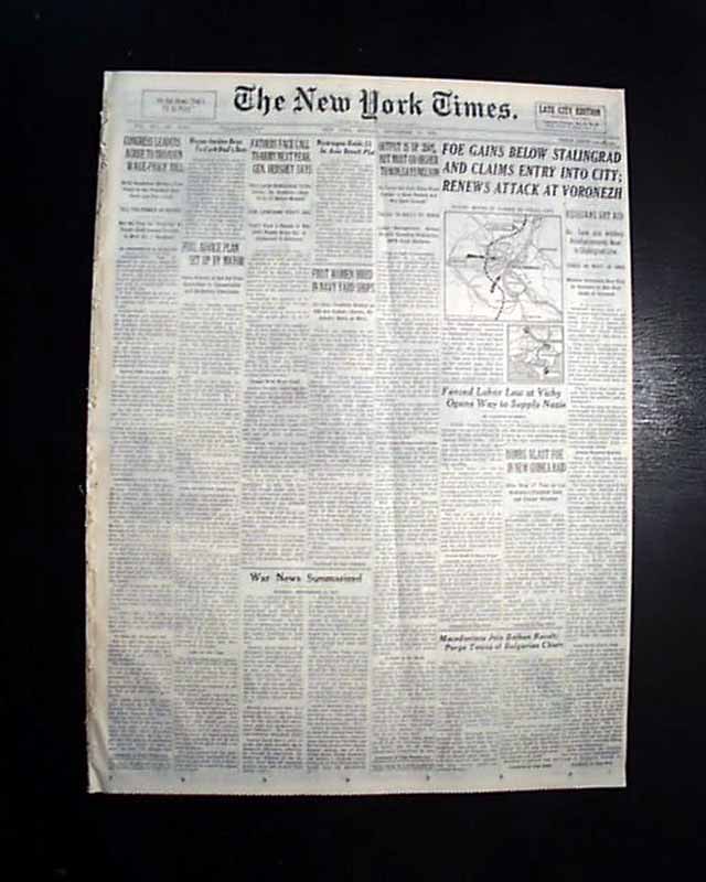 The front page has a three column headline: "FOE GAINS BELOW STALINGRAD AND CLAIMS ENTRY INTO CITY; RENEWS ATTACK AT VORONEZH" with subheads and map. Coverage near the start of the Battle of Stalingrad which is currently named Volograd, Russia.