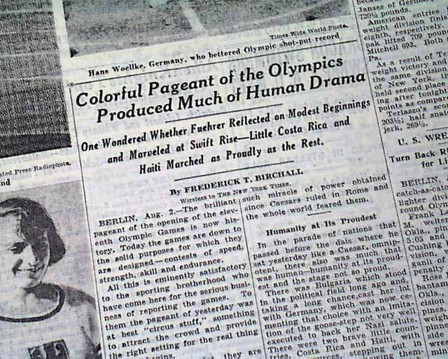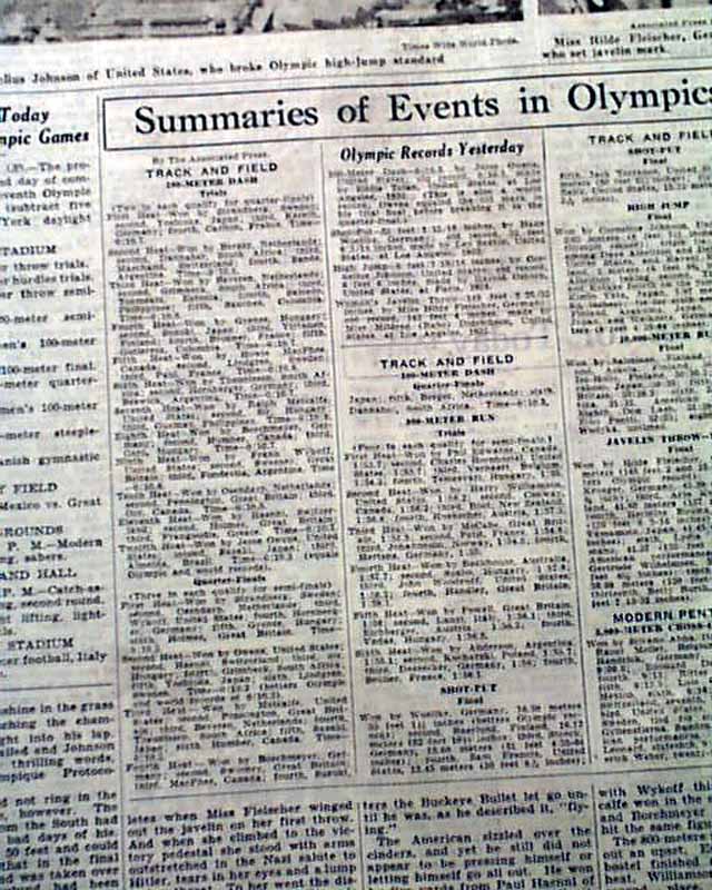 A sidebar to the Olympic games was Adolph Hitler's refusal to acknowledge the achievements of the African-American athletes, not surprising given his belief that only his superior German Aryan race would dominate at the games. This is corroborated by the front page column heads as noted above, and by front page text which includes: "...But for politically minded persons in the crowd there was one rather disquieting incident connected with the march of these three Americans to the victory pedestal. The Fuehrer had greeted all three medalists in other events--the Germans and the Finns--with a handclasp and words of congratulation. But five minutes before the United States jumpers moved in for the ceremony of the Olympic triumph Hitler left his box...." with more (see). Nice to have in this famous NYC title.