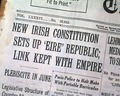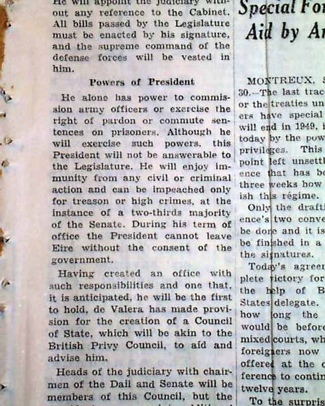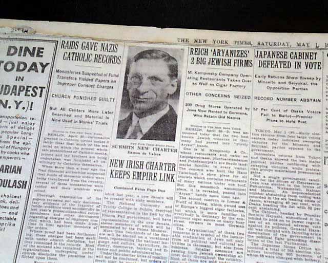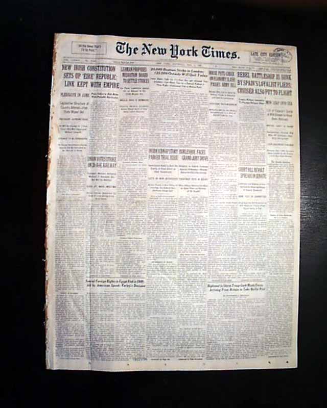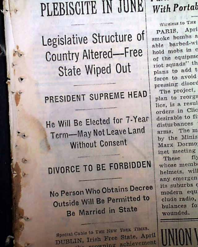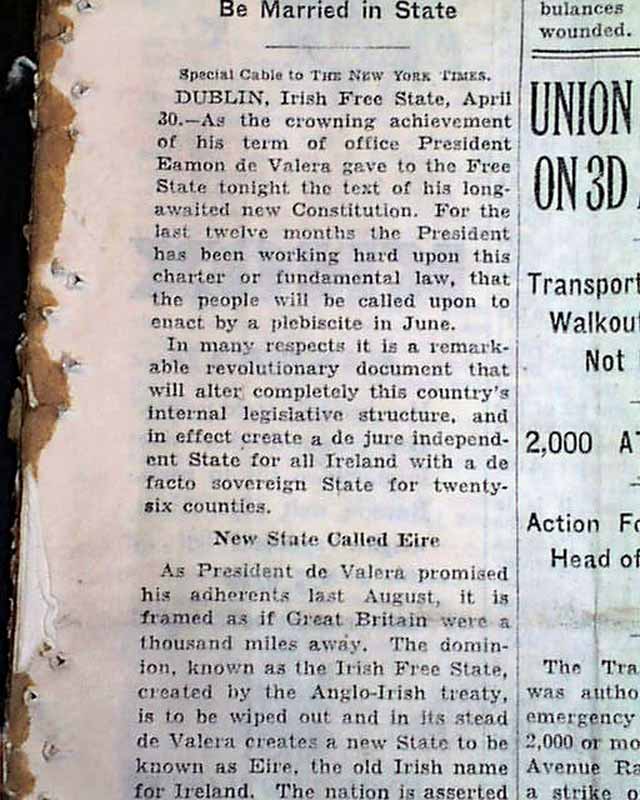 The front page has a two column headline: "NEW IRISH CONSTITUTION SETS UP 'EIRE' REPUBLIC; LINK KEPT WITH EMPIRE" with subheads and more on page 2 with photo of Eamon de Valera. 1st report coverage on the 2nd constitution of the Irish Free State announcement.