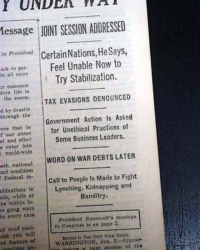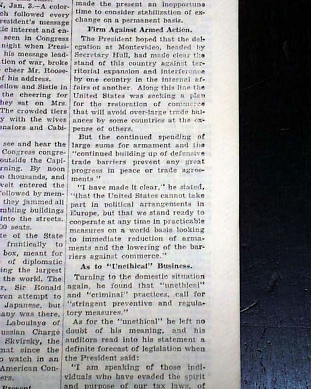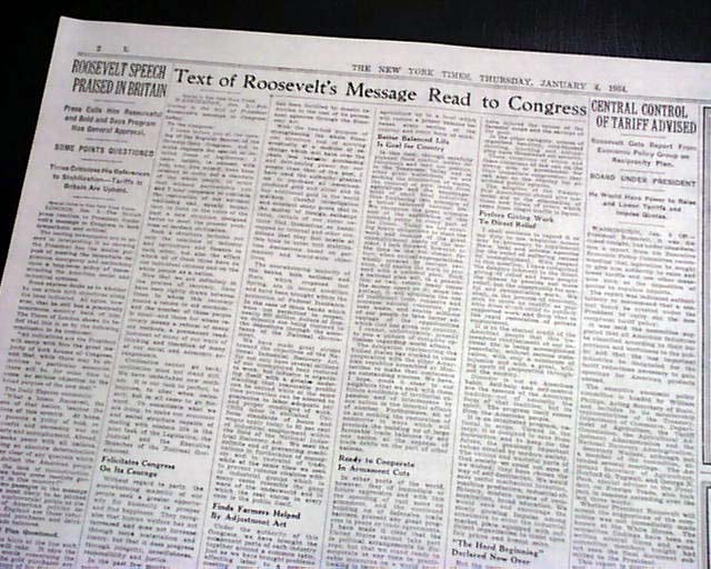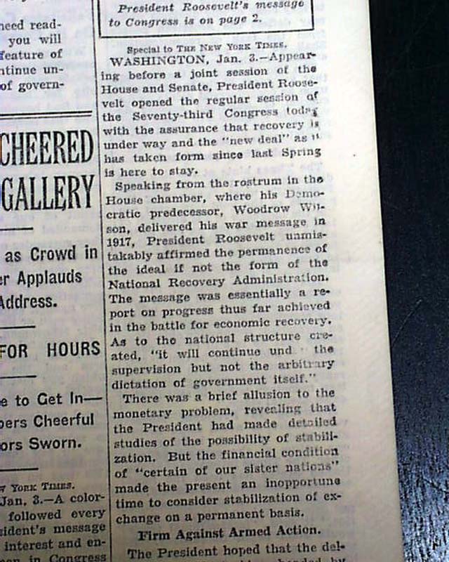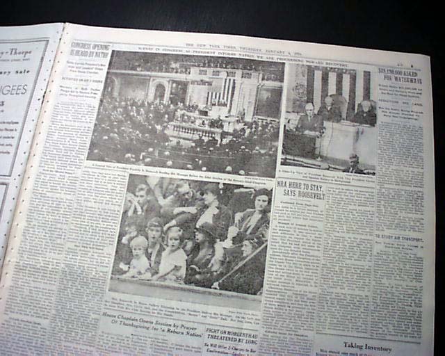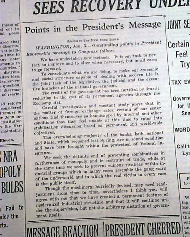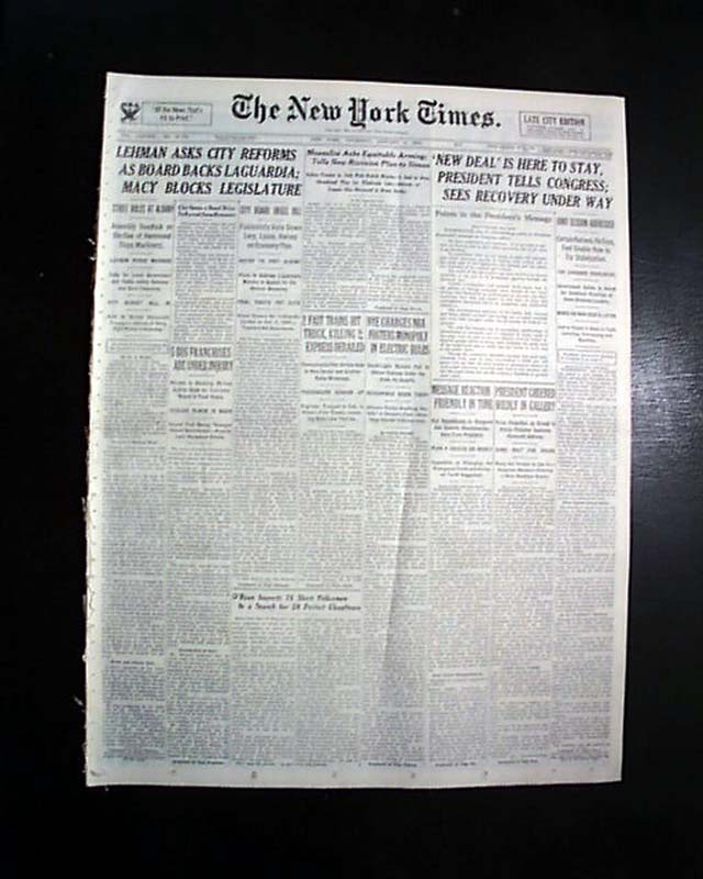 The front page has a three column headline: "NEW DEAL' IS HERE TO STAY, PRESIDENT TELLS CONGRESS; SEES RECOVERY UNDER WAY" with many subheads and and complete presidential message text. Much more inside with related photos. Always nice to have notable events in history reported in this World famous publication.