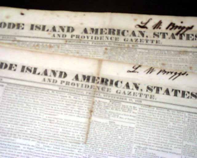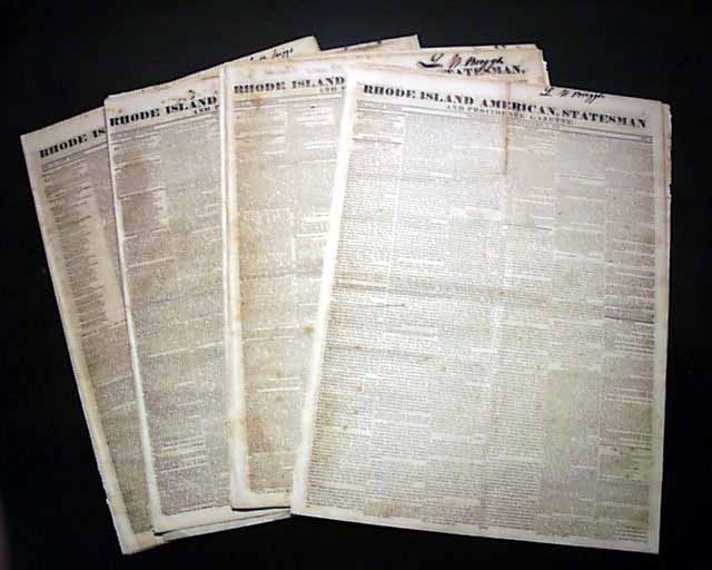 THE RHODE ISLAND AMERICAN, Providence, 1829  A lot of fifteen issues of this newspapers with much news of the day and a wealth of ads, including many illustrated ship ads.  Each issue cleanly loose at the spine, scattered foxing, good condition. Subscriber's name penned at the very top.
