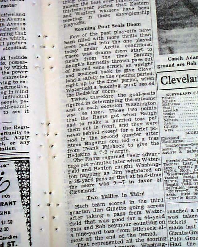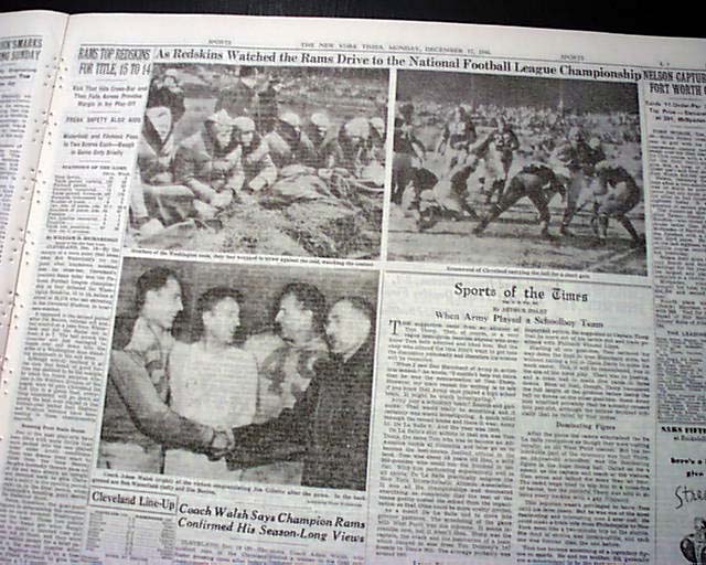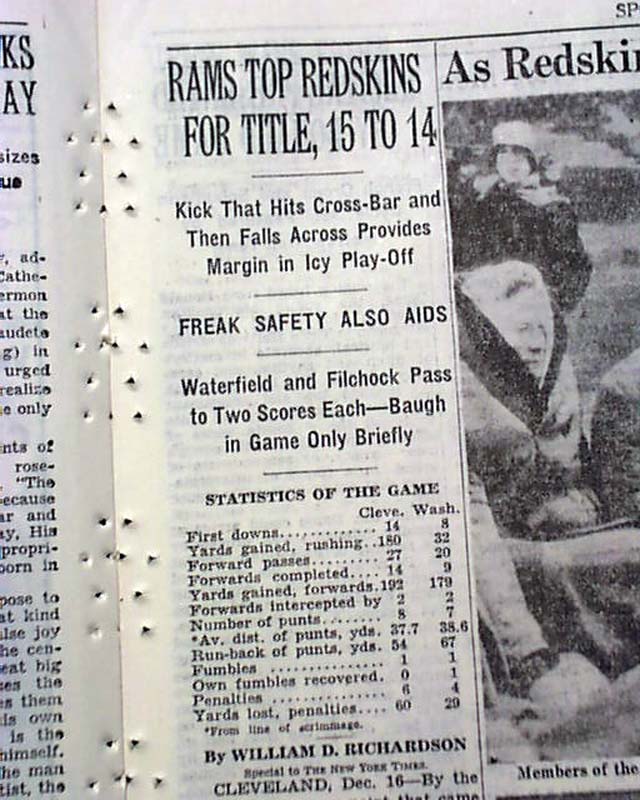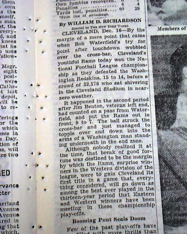 The sport's section (page 15) has a one column heading: "RAMS TOP REDSKINS FOR TITLE, 15 TO 14" with subheads, photos, stats and lineups. Always nice to have notable events in history reported in this World famous publication.