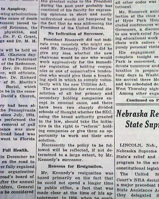 The front page has one column headings: "Kennedy Resigns as Sec Chairman"; "Roosevelt Praises His Leadership in Winning Confidence of Investors and Financiers" and more. (see) Article continues on page 4 with one column photo of Kennedy. Always nice to have notable events in history reported in this World famous publication.