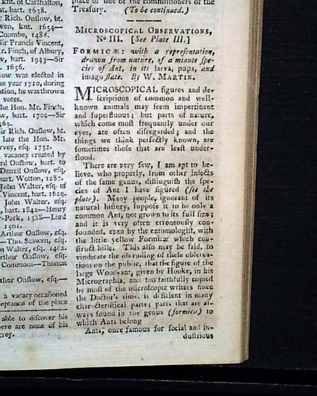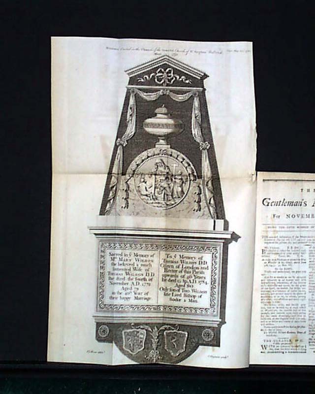 THE GENTLEMAN'S MAGAZINE, London, November, 1788 A feature of this issue would be the 3 plates which are still present, the first being a somewhat large foldout of the "Monument of Dr. Wilson at Walbrook Church" with a related article. Another has an interesting print showing microscopic images of ants, with a related article (see).