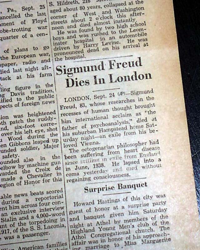 Page 5 has a small one column heading: "Sigmund freud Dies In London" See image for text here.
