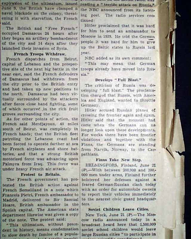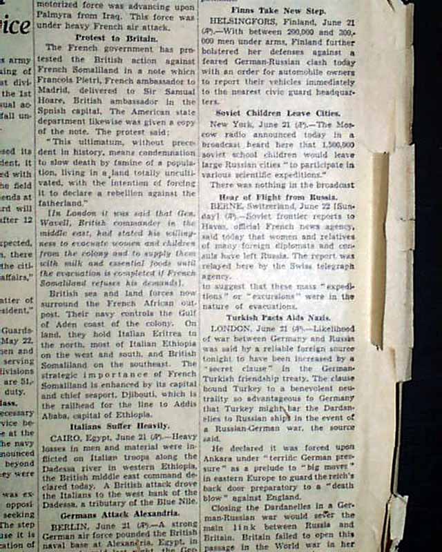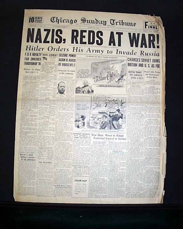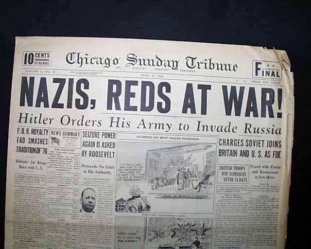 The front page has a nice banner headline: "NAZIS, REDS AT WAR!", with subheads: Hitler Orders His Army to Invade Russia" and "Charges Soviet Joins Britain And U.S. As Foe". The front page also has an interesting cartoon discouraging U.S. involvement in the war.
