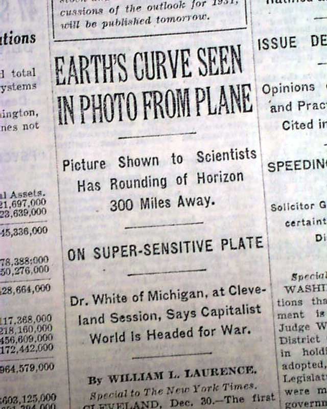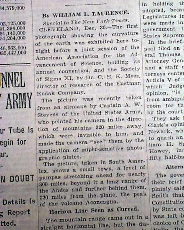 The front page has a one column heading: "EARTH'S CURVE SEEN IN PHOTO FROM PLANE" with subheads. See below for history description.