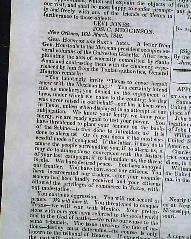 The back page has an article: "Gen. Houston and Santa Anna" which includes a quote by Houston: "...You tauntingly invite 'Texas to cover herself anew with the Mexican flag.' You certainly intend this as mockery...You continue aggression. You will not accord us peace. We will have it. You threatened to conquer Texas--we will war with Mexico..." with more (see photos). The letter is signed in type: Sam. Houston. Included as well is: "A Proclamation of Blockade" which is also signed in type: Sam. Houston.