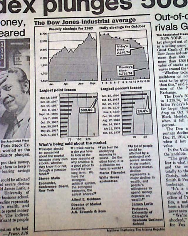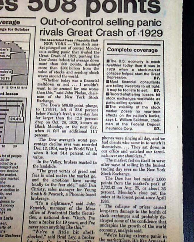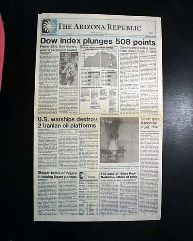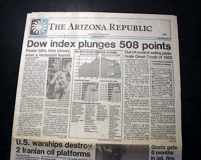 THE ARIZONA REPUBLIC, Phoenix, October 20, 1987 This newspaper has a banner headline on the front page that announces: "Dow index plunges 508 points" with subheads "Out-of-control selling panic rival Great Crash of 1929" and "Fewer jobs, less money, and even a recession feared", related photo and graph. This was perhaps the most notable stock market "crash" since the 1929 event, and an elusive issue as few were saved. More pages of coverage and stock market postings are inside the issue.
