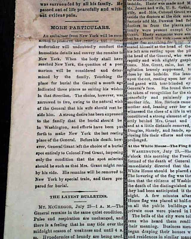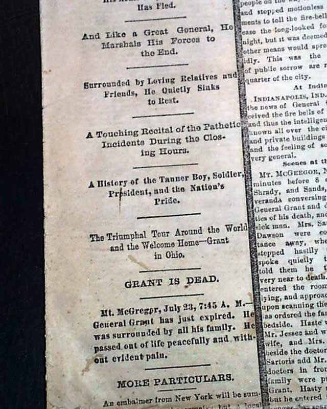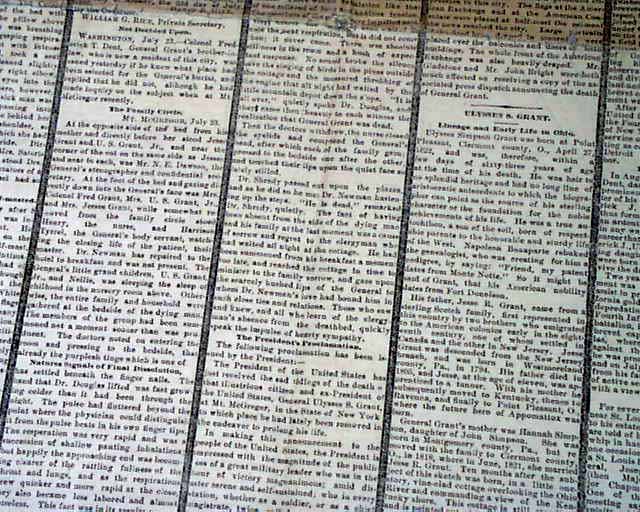 The first column of the front page has various heads on the death of President Ulysses S. Grant, headed with: "GRANT DEAD" and much more. Also a nice graphic showing Grant.