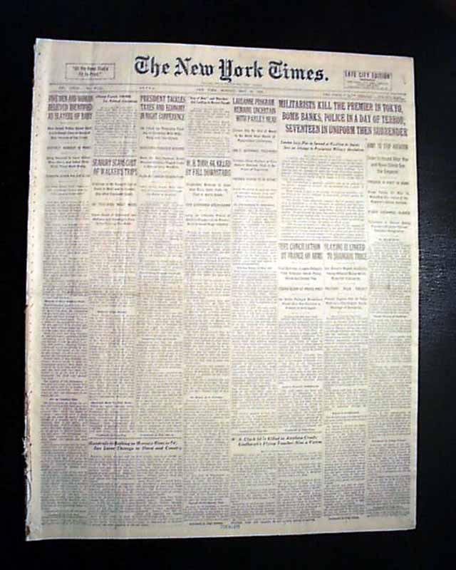 The top of the front page has a three column headline: "MILITARISTS KILL THE PREMIER IN TOKYO, BOMB BANKS, POLICE IN A DAY OF TERROR; SEVENTEEN IN UNIFORM THEN SURRENDER" with subheads. Lengthy 1st report coverage continues inside with a few related photos. Always nice to have notable events in history reported in this World famous publication.