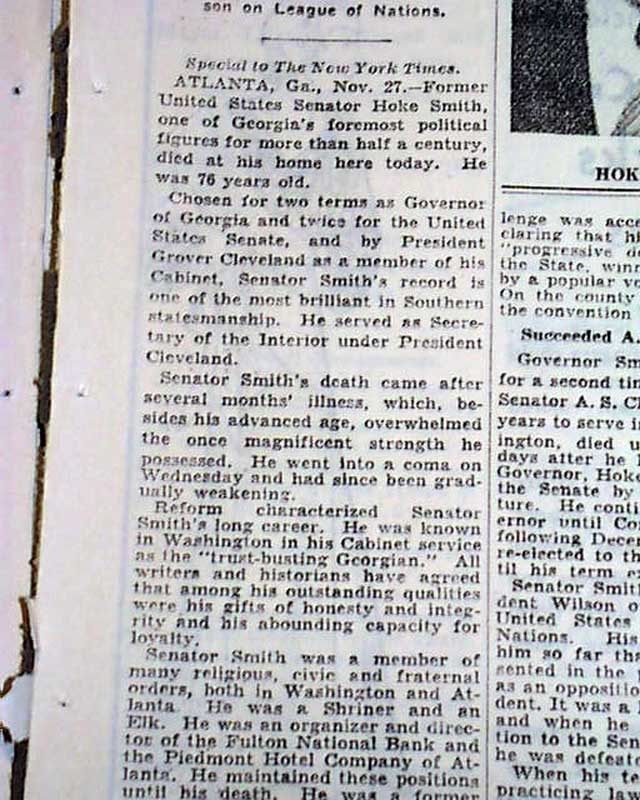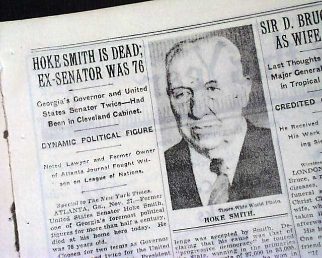 Page 17 has a one column heading: "HOKE SMITH IS DEAD; EX-SENATOR WAS 76" with subheads and photo. (see)