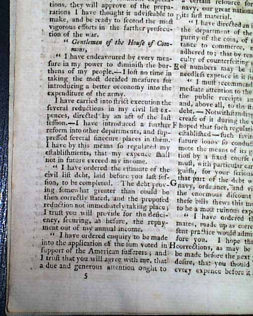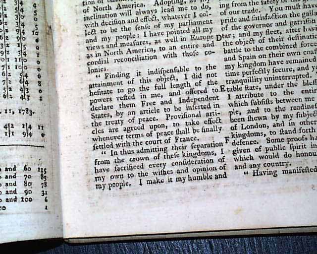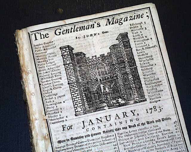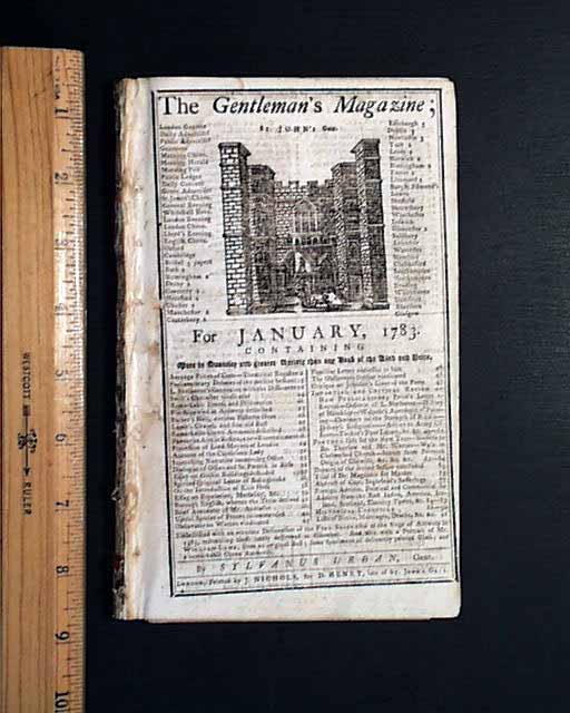 THE GENTLEMAN'S MAGAZINE, London, January, 1783 An exceedingly historic issue, particularly found in this British publication, in which the King of England formally recognizes the independence of the American colonies.The top of the first page is headed: "Proceedings in the Third Session of the Present Parliament, which met Dec. 5, 1782" followed by a lengthy speech delivered by the King of England before the House Of Lords, prefaced with: "The King came to the House of Peers, and being seated on the throne, and the Commons present, his Majesty opened the Session with the following speech:."