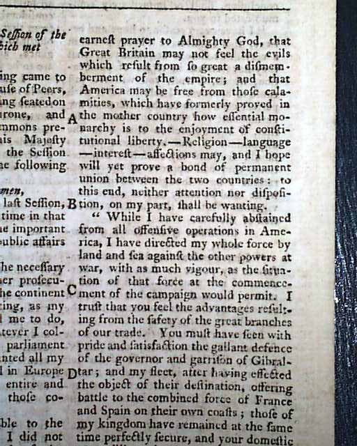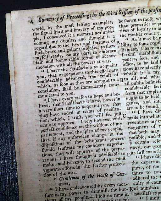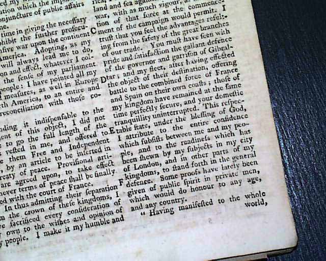 Hereafter is the text of the King's speech proclaiming the independence of America, reading in part: "Since the close of the last Sessions...I lost no time in giving the necessary orders to prohibit the further prosecution of offensive war upon the continent of North America....I have pointed all my views and measures, as well in Europe as in North America, to an entire and cordial reconciliation with those Colonies. Finding it indispensable to the attainment of this object, I did not hesitate to go the full length of the powers vested in me, and offered to declare them Free and independent States, by an article to be inserted in the treaty of peace....In thus admitting their separation from the crown of these kingdoms....I make it my humble and earnest prayer to Almighty God, that Great Britain may not feel the evils which might result for so great a dismemberment of the empire; and that America may be free from those calamities, which have formerly proved in the mother Country how essential monarchy is to the enjoyment of constitutional liberty..." & more.