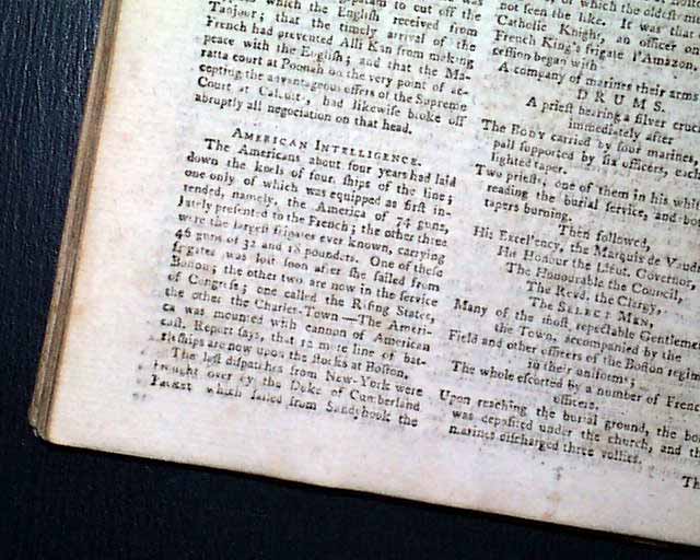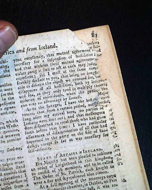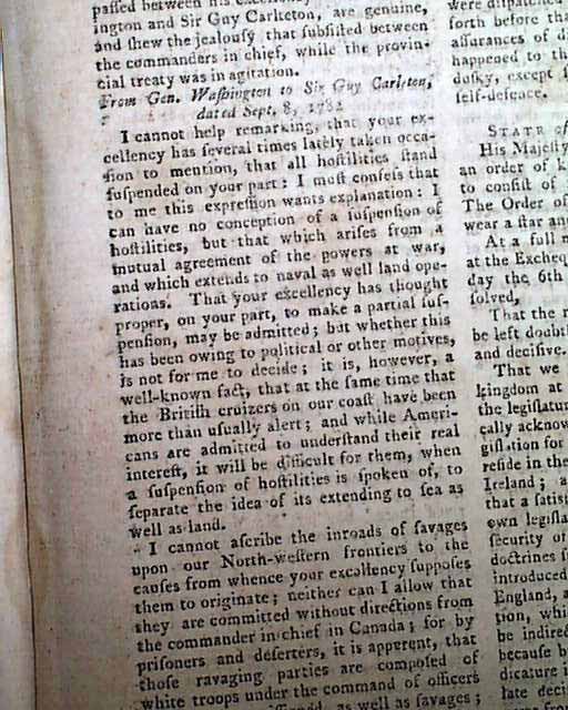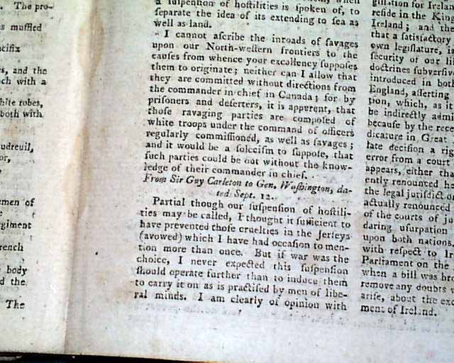 Near the back is some: "American Intelligence" which includes a letter: "From Gen. Washington to Sir Guy Carleton" which begins: "I cannot help remarking that your excellency has several times lately taken occasion to mention that all hostilities stand suspended on your part: I must confess that to me this expression wants explanation..." with more. This is followed by the response: "From Sir Guy Carleton to Gen. Washington" (see).