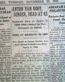 Page 19 has a one column heading: "ANTON VAN ROOY, SINGER, DEAD AT 62" with subheads. (see) First report coverage on the death of Anton van Rooy, Dutch bass-baritone opera singer. I suspect this is one of the few publications to report this particular event as other titles in our inventory do not.