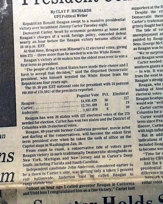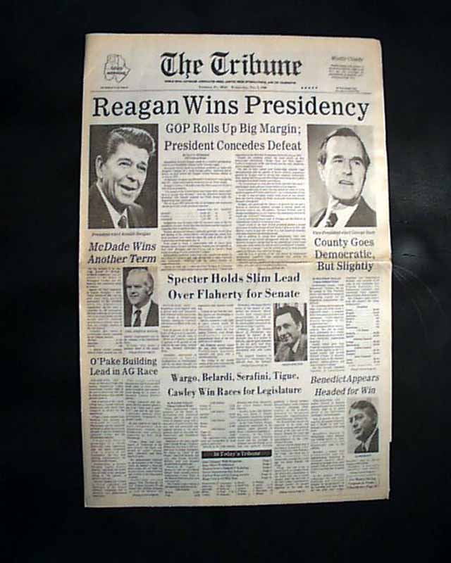 The banner headline proclaims: Reagan Wins Presidency" with subheads and photos of Reagan & V.P. Bush. (see)