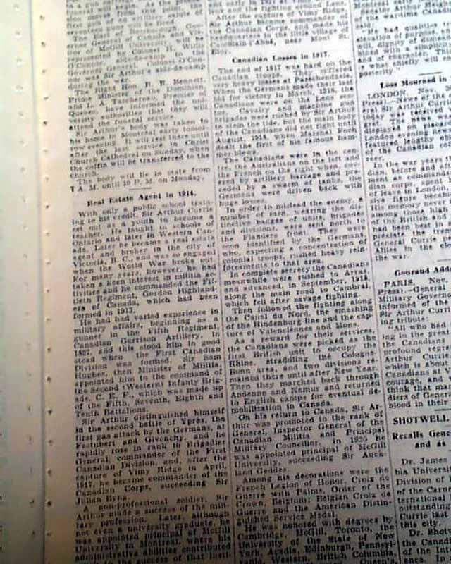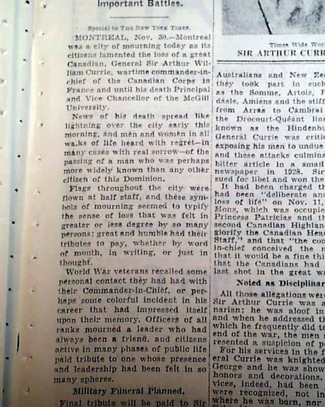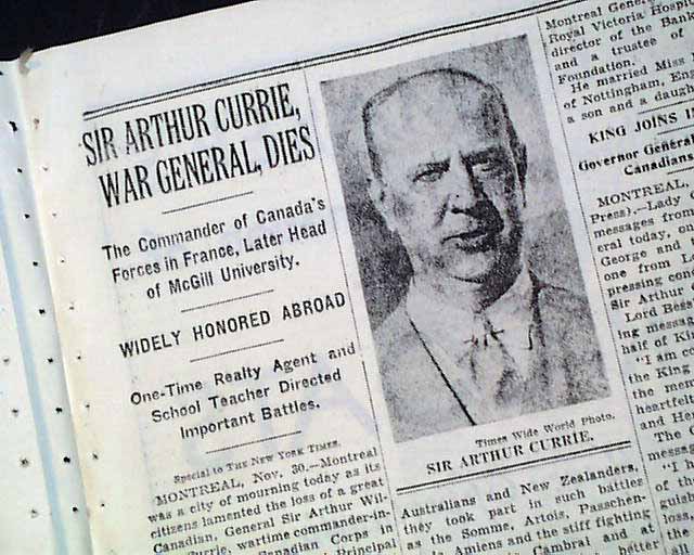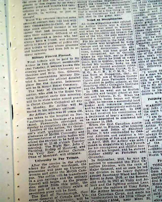 The top of page 19 has a one column heading: "SIR ARTHUR CURRIE, WAR GENERAL, DIES" with subheads and photo. (see) Lengthy text here.