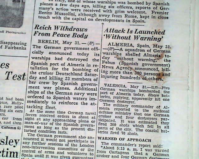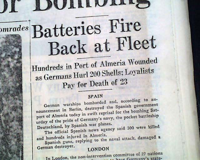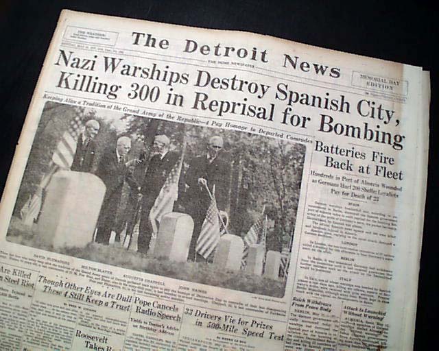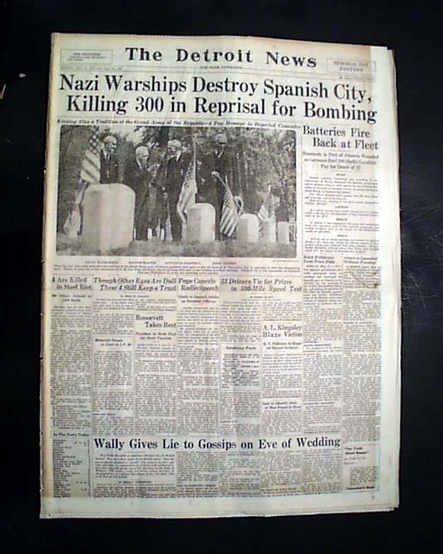 The top of the front page has a banner headline: "Nazi Warships Destroy Spanish City, Killing 300 in Reprisal for Bombing" with subheads. (see)