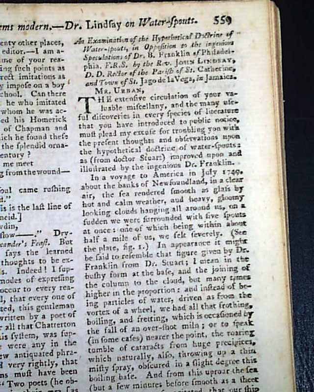 There is additional reporting on the Revolutionary War, particularly the events in Georgia & the Carolinas, including a letter signed by Nath. Greene (see) , as well as an article on waterspouts with: "...the ingenious speculations of Dr. B. Franklin of Philadelphia..." on this topic (see). Also present is the foldout plate showing waterspouts (see).