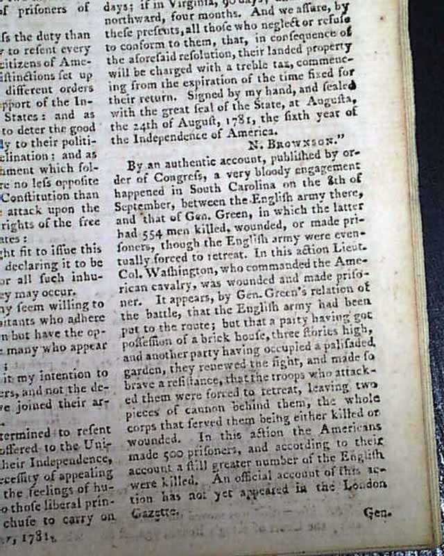 Certainly the most historic report in this issue--and perhaps in any issue from the Revolutionary War--is that near the back of the issue under the "Historical Chronicle". It begins with an editorial comment: "Gen. Washington's letter to the President of Congress on the surrender of the British army under Lord Cornwallis is truly characteristic. The whole substance is comprised in the few words that follow: " and what follows is the historic letter datelined "York, Oct. 19, 1781" which begins with the famous sentence: "I have the honour to inform Congress that the reduction of the British army under the command of Lord Cornwallis is most happily affected..." followed by further particulars on the event (see photos). Shortly after this is a note from the House of Lords: "...expressed his sorrow for the loss we had recently sustained in the capture of Lord Cornwallis and his army & warmly complimented that noble & gallant commander as well for his bravery, spirit & good conduct as for his having surrendered on capitulation in a moment of great exigence & thereby prevented his army from becoming a sacrifice to the sword..." with a bit more (see).