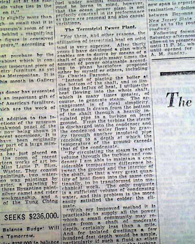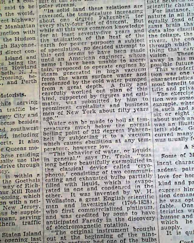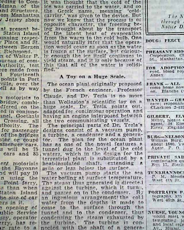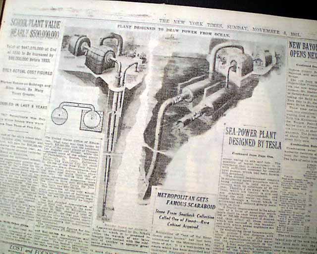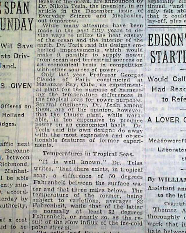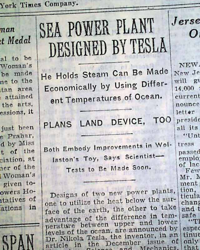 The front page of section two (inside) has one column headings that include: "SEA POWER PLANT DESIGNED BY TESLA" "He Holds Steam Can Be Made Economically by Using Different Temperatures of Ocean" and more. Report continues on the next page with related illustration. (see)