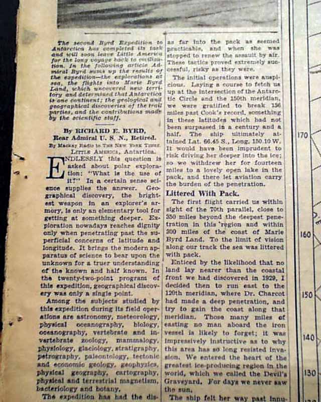 The front page of this section has a banner headline: "ANTARCTIC DISCOVERIES: BYRD'S OWN STORY" with subheads, 3 related illustrations and map. (see) Lengthy text continues inside.