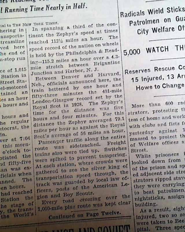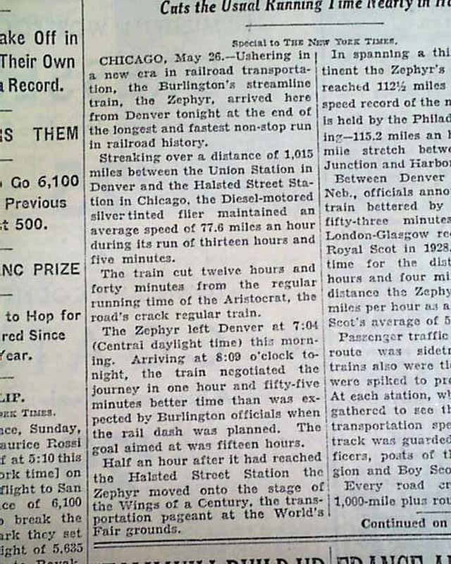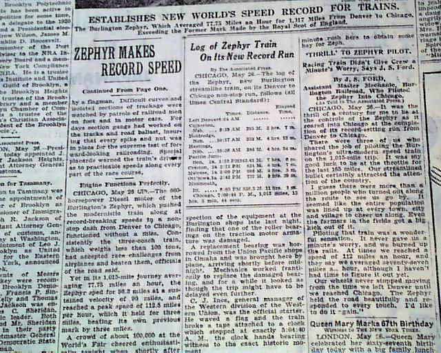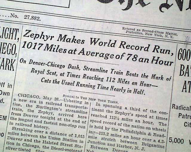 The top of the front page has a two column heading: "Zephyr Makes World Record Run, 1017 Miles at Average of 78 an Hour" with subhead. (see) First report coverage on this record setting journey. See below for details.