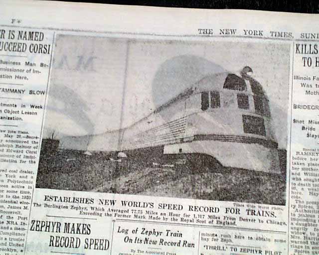 wikipedia notes: On May 26, 1934, the Pioneer Zephyr set a speed record for travel between Denver, Colorado, and Chicago, Illinois, when it made a 1,015-mile non-stop "Dawn-to-Dusk" dash in 13 hours 5 minutes at an average speed of 77 mph. For one section of the run it reached a speed of 112.5 mph, just short of the then US land speed record of 115 mph. The historic dash inspired a 1934 film and the train's nickname, "The Silver Streak"