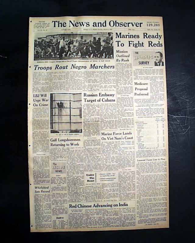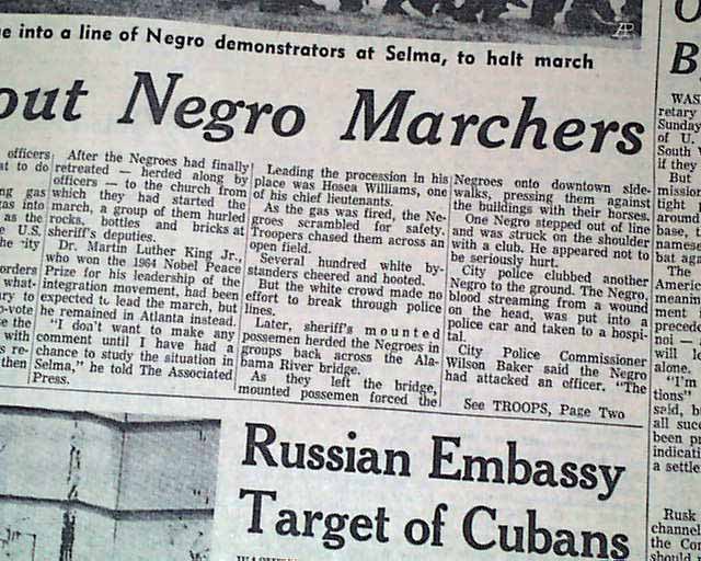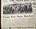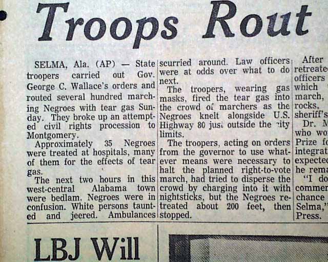 The front page has a five headline: "Troops Rout Negro Marchers" with photo. (see) First report coverage on the "Bloody Sunday" civil rights march at Selma, Alabama which ended in violence.