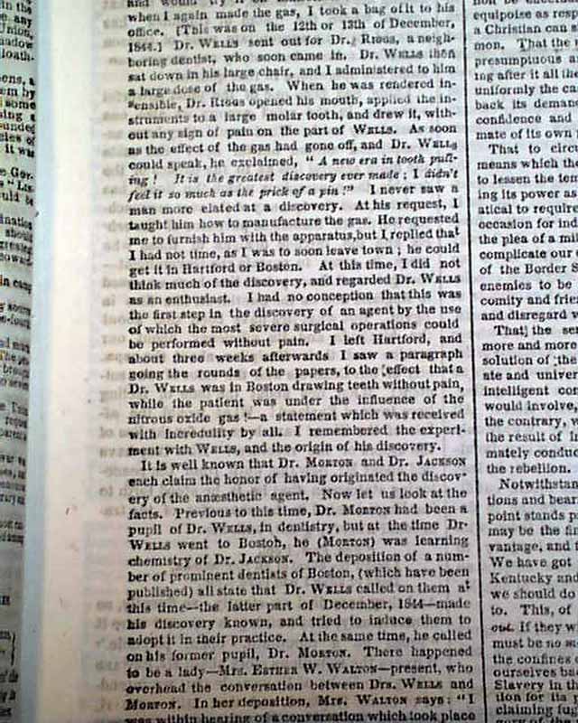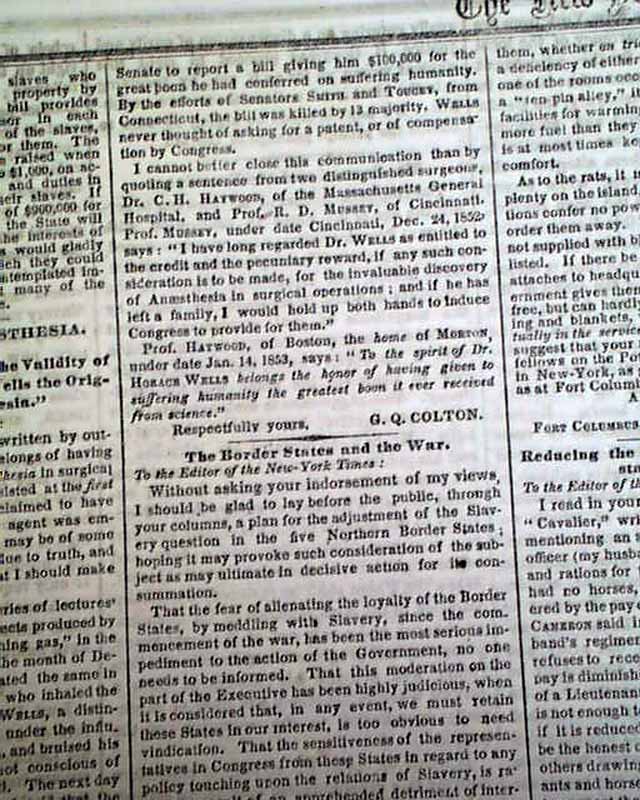 NEW YORK TIMES, Feb. 5, 1862  Page 3 has an article: "The Invention of Anesthesia" "Facts from an Eye Witness--The Validity of the Ether Patent--Horace Wells the Original Discoverer of 'Anesthesia' ". This letter was written by G. Q. Colton concerning work done in 1844, corroborated by the report in this hyperlink.