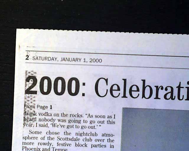 TRIBUNE EXTRA, Tempe, Arizona, January 1, 2000 The bold banner on this issue simply reads "Jan. 1, 2000" with a sub headline "The night was unlike any other". This issue contains numerous articles and photos of how the turn-of-the-century was celebrated at various areas throughout the world. The anticipated doomsday, Y2K, never occurred.