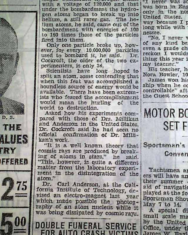 Page 20 has a very historic report which notes the very beginning of the "atomic age" with one column headings: "ATOM BROKEN IN EXPERIMENT" "Hydrogen Turns Into Helium Under Electrical Bombardment"