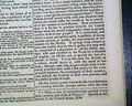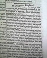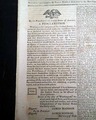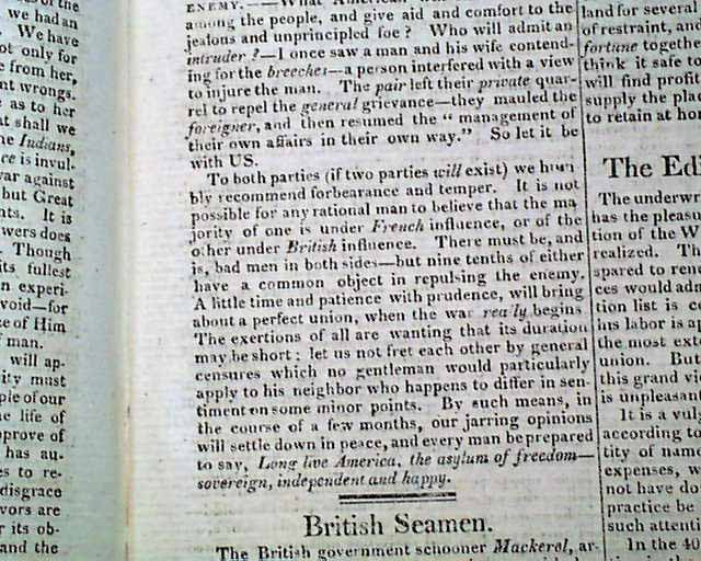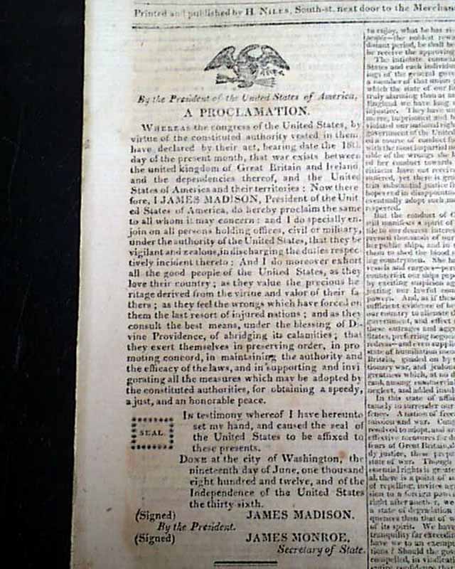 Most of the first column of the front page is a somewhat decorative "Proclamation" headed with an engraving of a heraldic eagle & signed by James Madison, declaring that a state of war exists between the United States & England, marking the official beginning of the War of 1812. Inside has a nice editorial: "War Against England" which takes close to 2 pages and includes near the end: "War is Declared--Great Britain is the Enemy..." and at the very end: "...and every man be prepared to say, Long live America, the asylum of freedom--sovereign, independent and happy." (see).