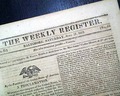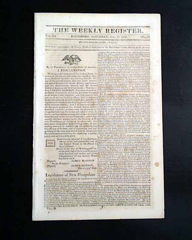 THE WEEKLY REGISTER, Baltimore, June 27, 1812 This issue has one of the best presentations on the declaration of war against Great Britain, beginning the War of 1812.