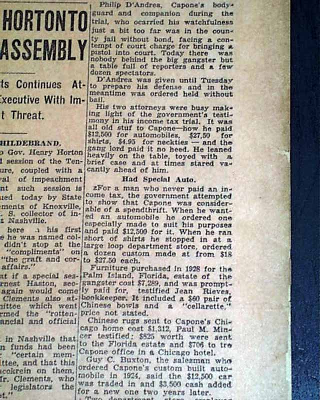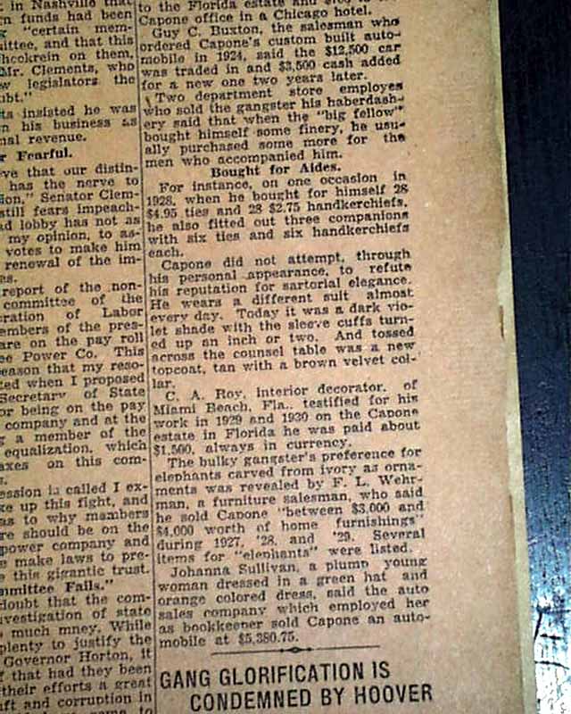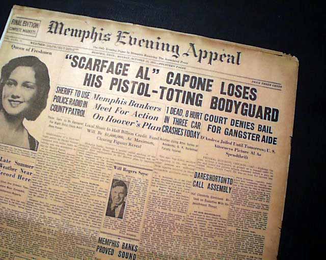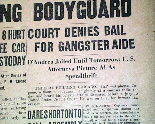 The front page has a nice six column headline: "'SCARFACE AL' CAPONE LOSES HIS PISTOL-TOTING BODYGUARD" with subheads. (see)