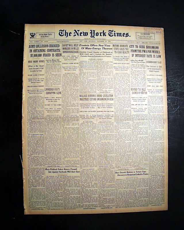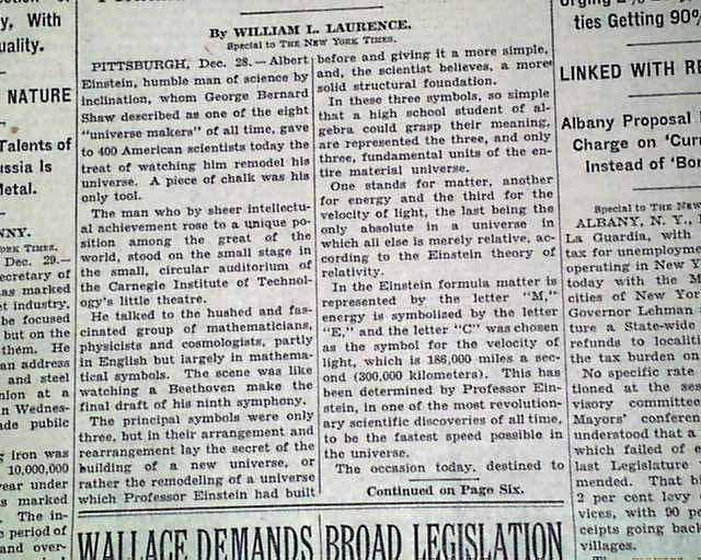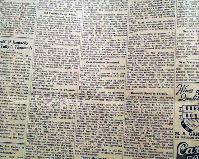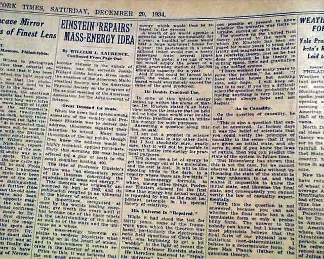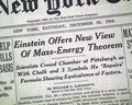The top of the front page has a two column headline: "Einstein Offers New View Of Mass-Energy Theorem" with subhead. (see) Coverage continues on page 5 with lengthy text here.