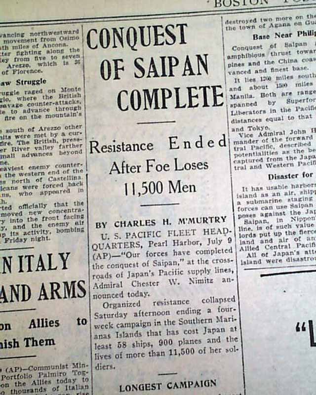 The front page has a two column heading: "Saipan Conquest Completed--Foe Ends Battle After Loss of 11,500 Men in Savage Fight" The report is actually on page 5 under: "CONQUEST OF SAIPAN COMPLETE" with subhead.