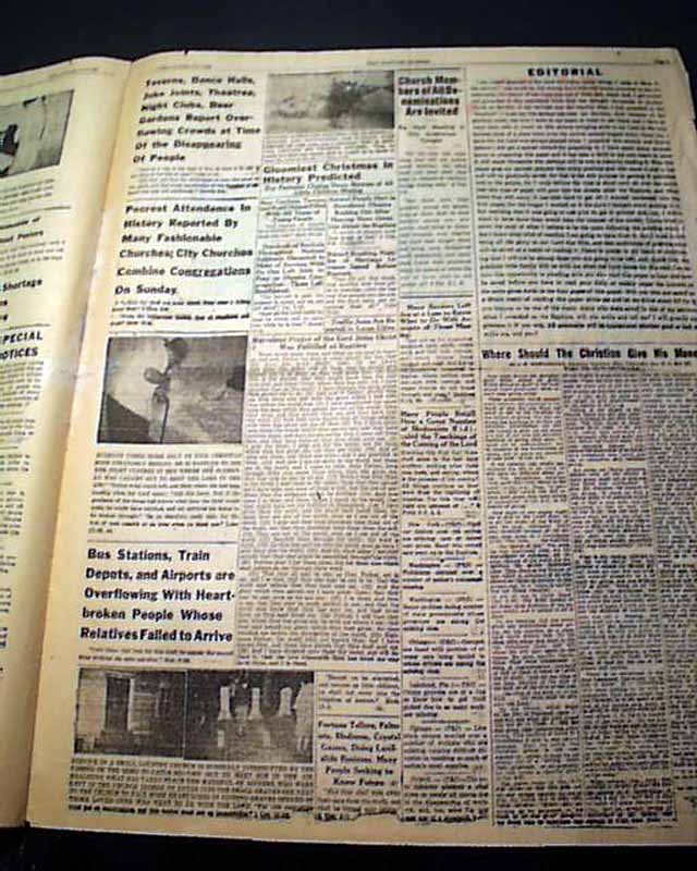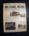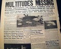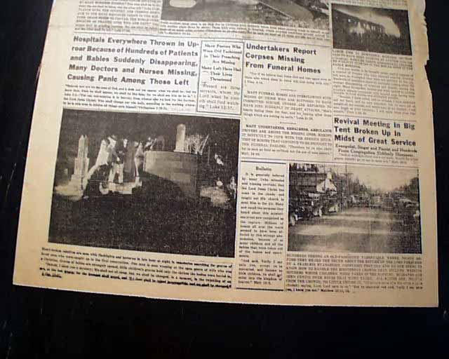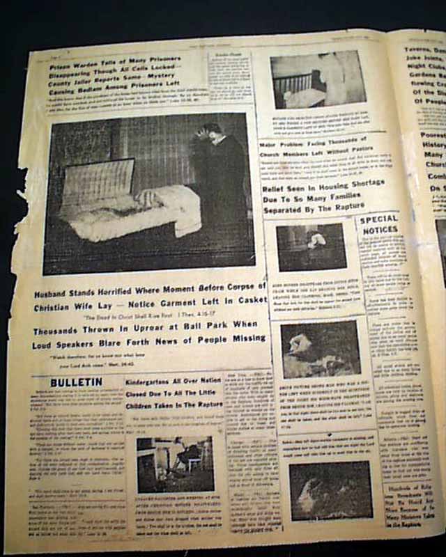 POST RAPTURE JOURNAL--EXTRA, Tribulation City 666 A fascinating "newspaper", the creation of a Christian group, the Victory Tract League, to show what life would be like on earth immediately after the Rapture. The large & bold banner headline announces: "MULTITUDES MISSING" with: "Nations Throughout The World Alarmed Over The Mysterious Disappearing of People From Off The Earth" with articles throughout the 4 pages focused on what such news reports would be like. One such head: "Hospitals Everywhere Thrown in Uproar Because of Hundreds of Patients & Babies Suddenly Disappearing, Many Doctors & Nurses Missing, Causing Panic Among Those Left". Many photos as well, one with a partial caption: "...One man is seen weeping at the open grave of wife who was a Christian. Graves of babies are strangely opened...".