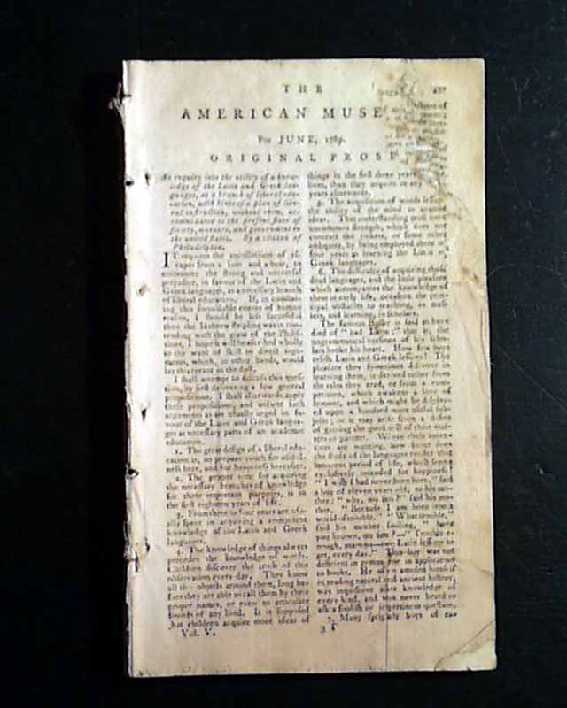 This title, along with the "Columbian Magazine", has the honor of being the first successful American magazine, both published in Philadelphia. The Museum was published by Mathew Carey and existed from January, 1787 thru the end of 1792.
