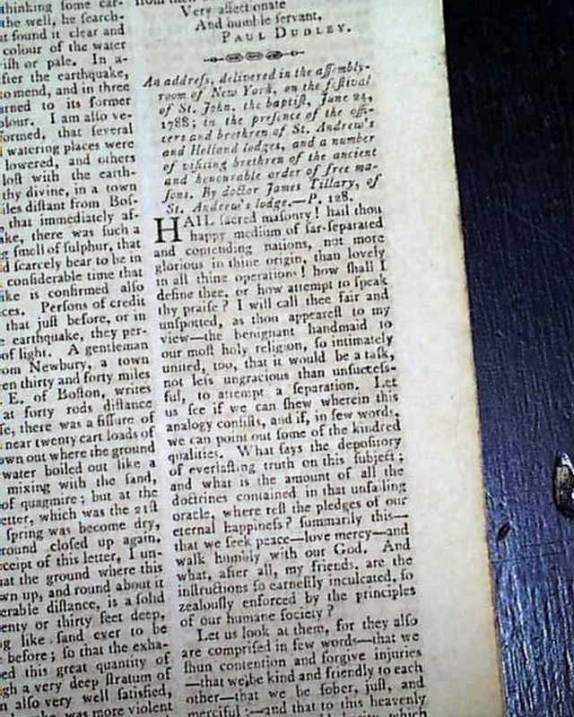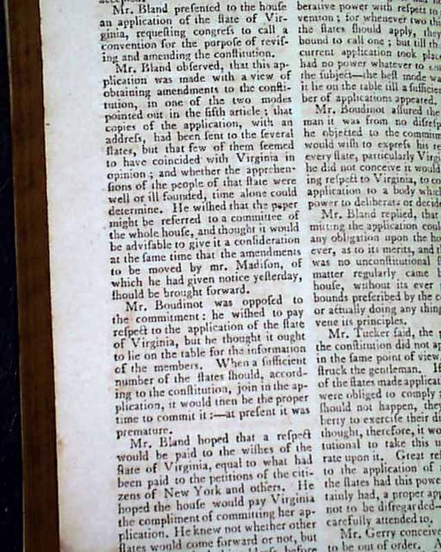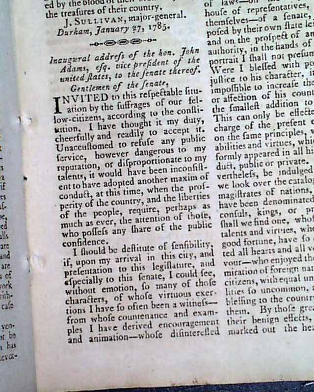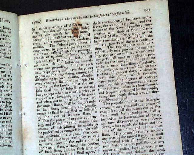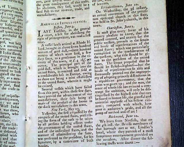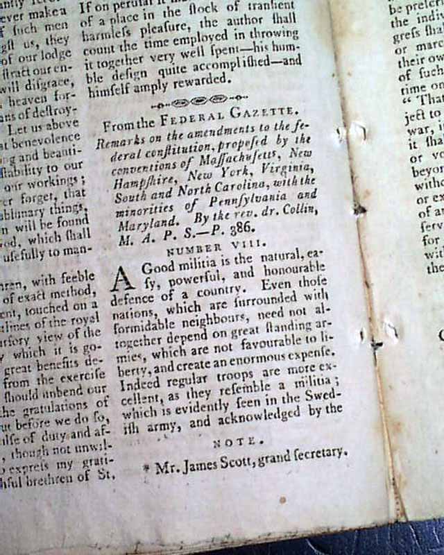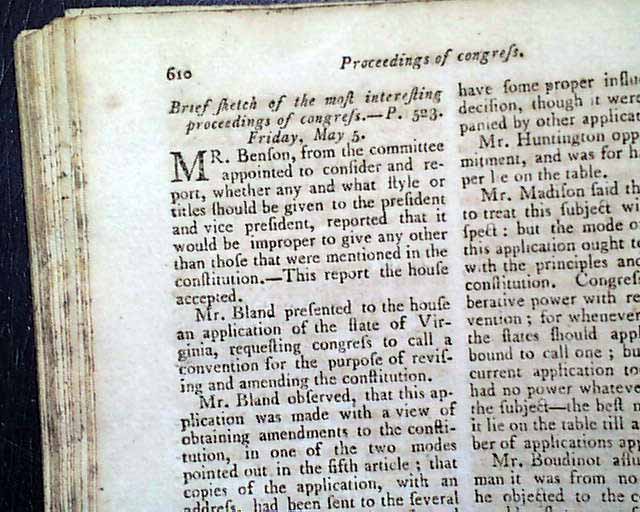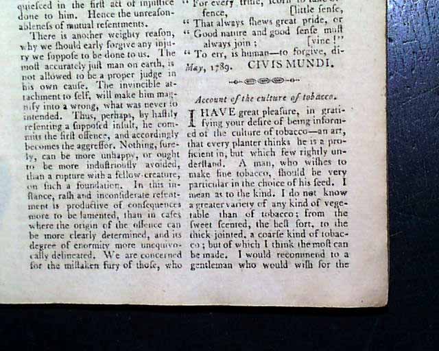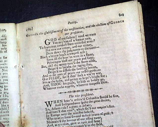 Among the articles within are: "Physical & meteorological Observations, Conjectures & Suppositions, by Benjamin Franklin" which takes 4 pages; "Account of the Culture of Tobacco" "Remarks on Dueling" "Observations Relative to a Commercial Treaty with Great Britain" "Inaugural Address of the Hon. John Adams, Vice President of the United States" which takes over a page and is signed by him in type: John Adams (see); a "Masonic Address"; some great discussion on: "Remarks on the Amendments to the Federal Constitution..." proposed by various states & which takes over 2 pages; a poem: "On the Establishment of the Constitution & Election of George our President" (see); and a report noting: "Yesterday the first act passed by the congress of the United States, prescribing the form of the oath to be taken by all persons holding offices under the government of the United States...". And of great significance are over ten pages of "Proceedings of Congress" which offers an excellent opportunity to eves-drop on the earliest discussions in the new federal congress. One of the discussions focus on what title to give the President of the United States, with some interesting thoughts (see for beginning).