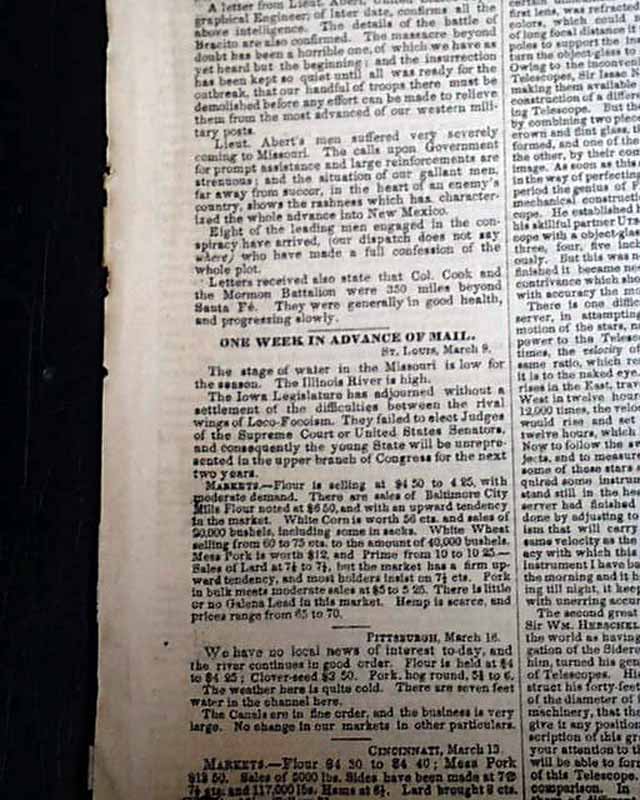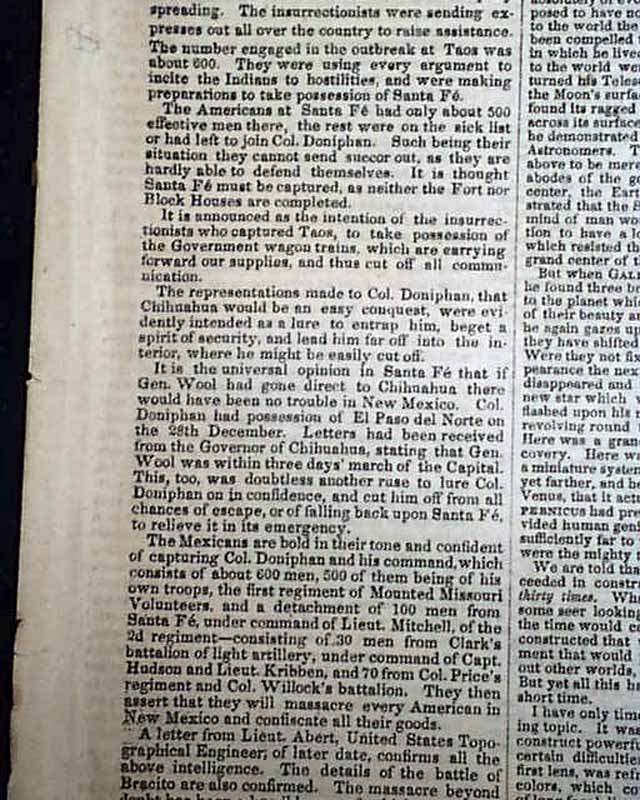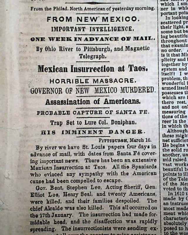 NEW YORK TRIBUNE, March 18, 1847  The ftpg. has a notable report on the Taos Revolt (see the web) with several column heads including: "From New Mexico" "Important Intelligence" "Mexican Insurrection at Taos" "Horrible Massacre" "Governor of New Mexico Murdered" "Assassination of Americans" "Probable Capture of Santa Fe".